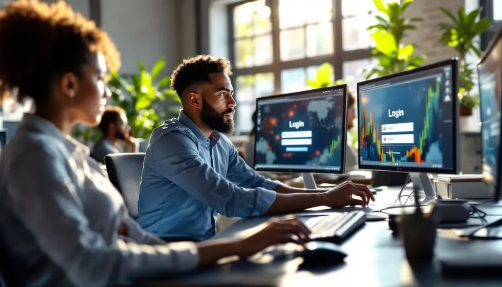 Oficina moderna con equipos y pantallas login